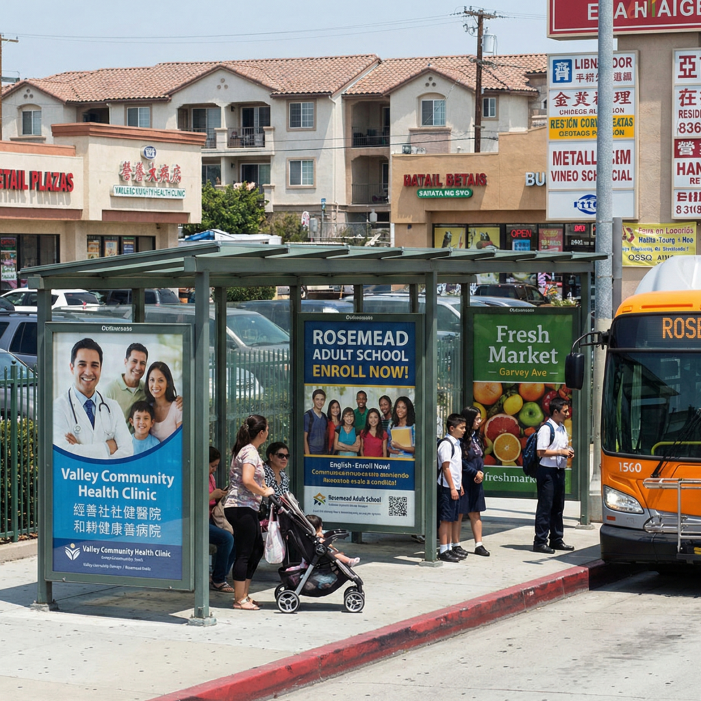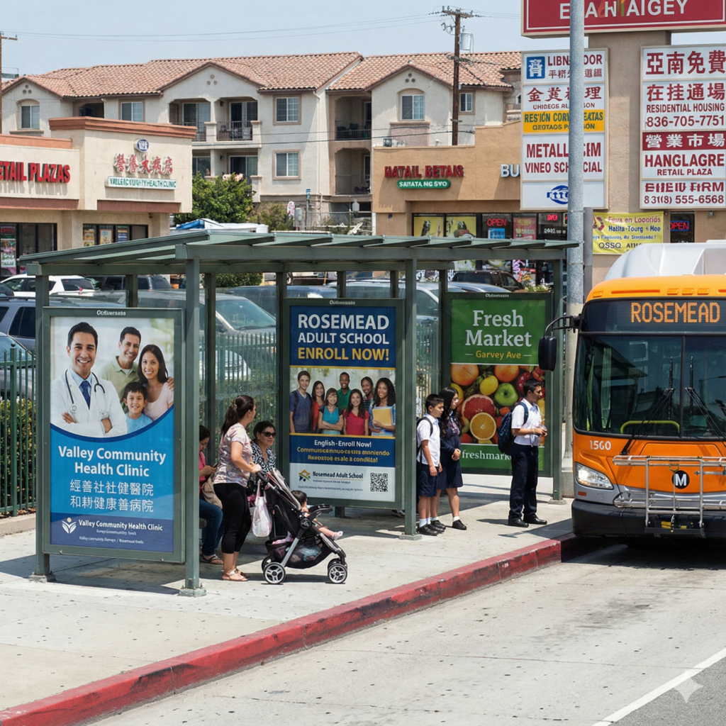 Rosemead has a well-developed public transportation grid served by LA Metro and local transit agencies. Bus shelter ads along Valley Blvd, San Gabriel Blvd, and Garvey Ave allow advertisers to reach: